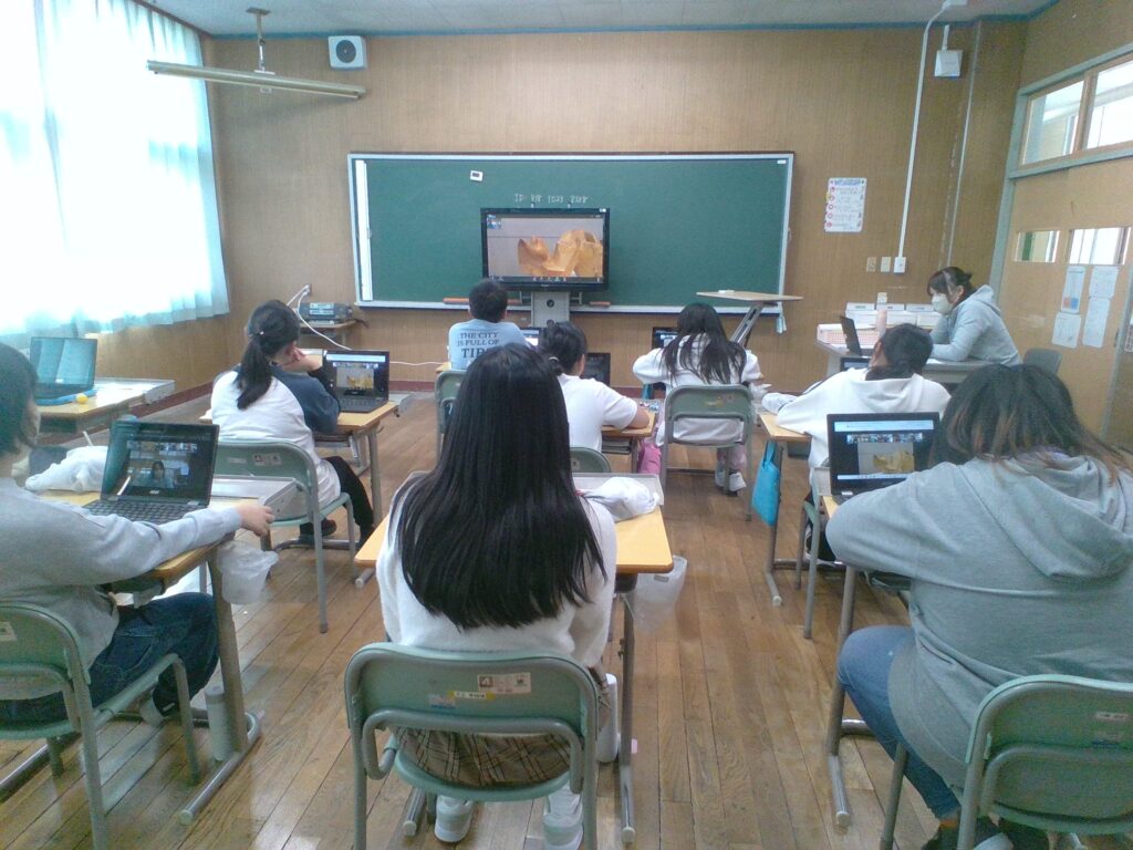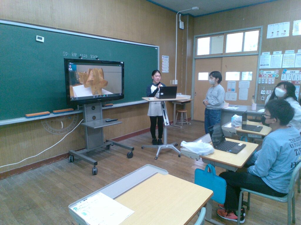 5・6年生を対象に帯広美術館主催のオンラインアート授業を行ないました。一見犬に見えない犬をイメージした木の彫刻物「アデラ」を、オンラインで鑑賞しました。学芸員から「作者が飼っていた大好きな犬が亡くなった後、思い出をイメージして形に表したもの」と紹介されてからは「説明を聞いて作品のイメージが変わりました」「作った人の思いが込められていると分かりました」等と感想を交流していました。今までなじみのなかった抽象的な作品には、木の形、なめらかさ、優しさなどから作者の思いが込められていることに気づくことができました。