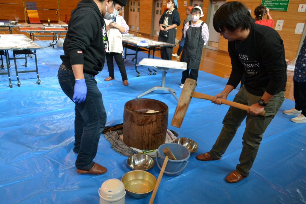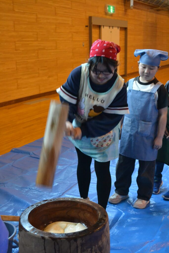 小学校で初めてもちつきをしました。杵で順番に餅をつき、ちぎって、きな粉や醤油で味を付け頂きました。お母さん方が丸めていただいたあんこ餅もいただきました。子供たちには磯部餅が一番人気でした。保護者の皆様の協力をいただきながら冬の伝統行事を行うことで、持続可能な地域づくりについて学びました。
